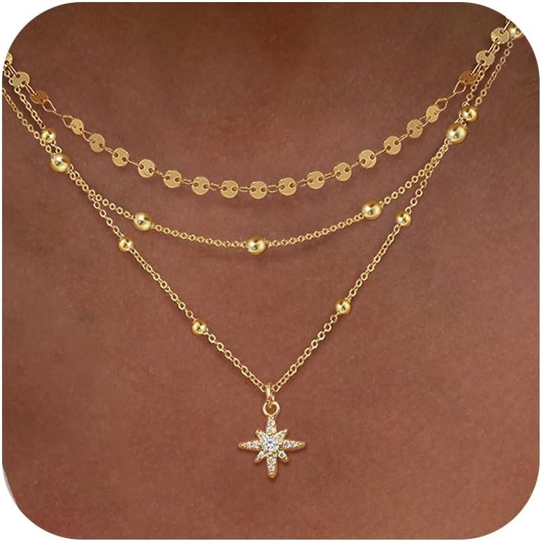 Layered Necklaces for Women, Dainty Gold Necklace Stack 14k Gold Plated Layering Beads Chain Pendant Necklace Set Simple Gold Necklaces for Women Trendy Fashion Accessories Jewelry Sets