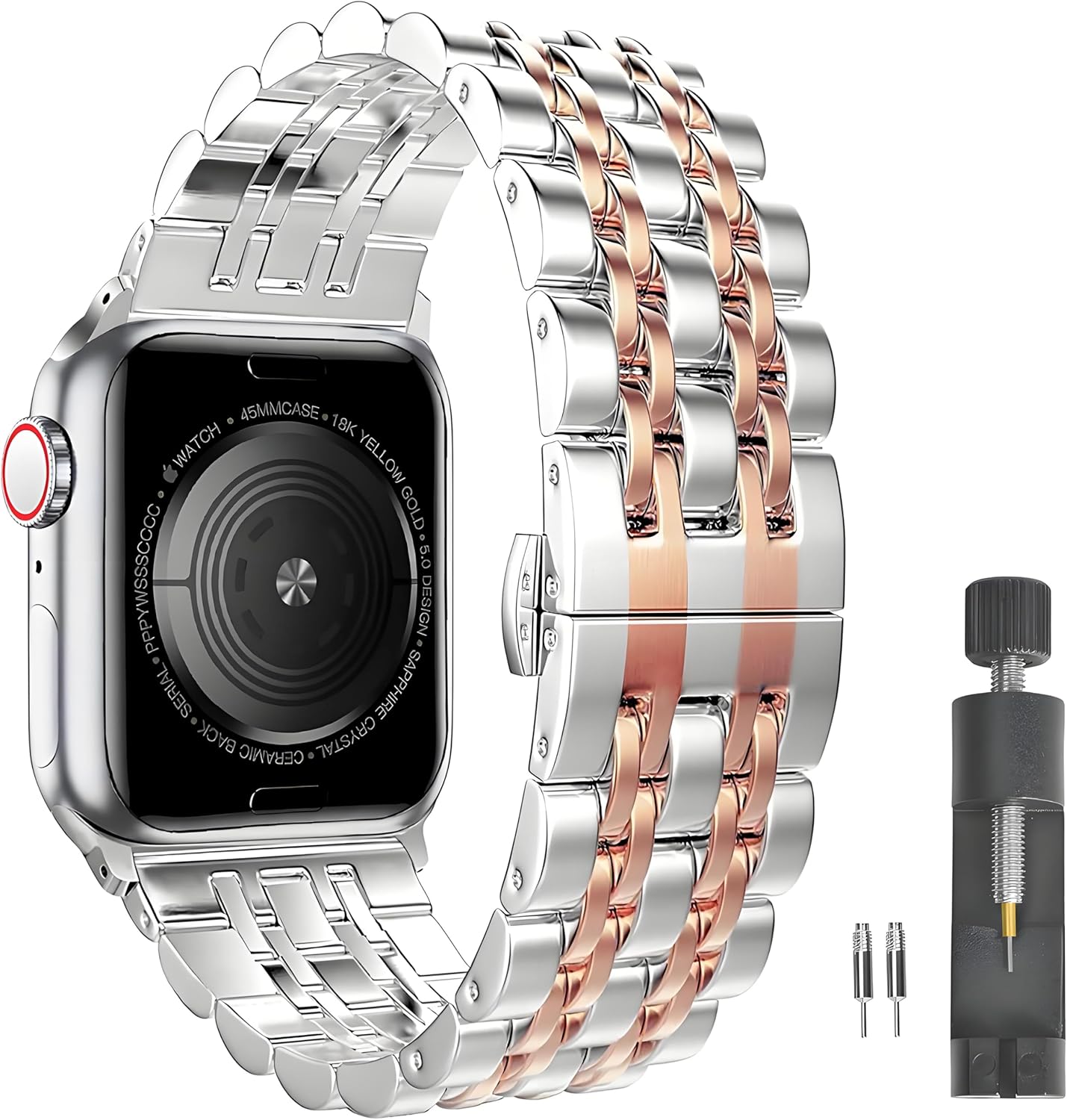 Stainless Steel Band Compatible with Apple Watch 49mm 46mm 45mm 44mm 42mm 41mm 40mm 38mm, Business Strap for iWatch Series 11 10 9 8 7 6 5 4 3 2 1, SE3 2 1, Ultra3 2 1, Two-Tone Metal Bands, Butterfly Clasp, Adjustable Links with Removal Tool