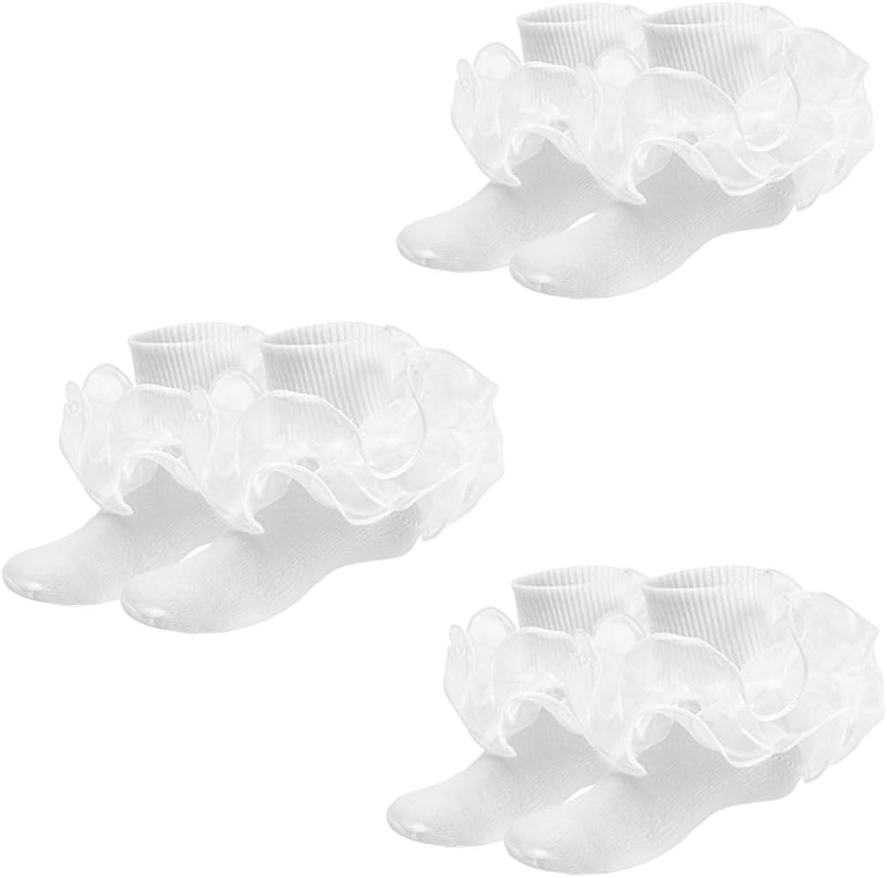 3 Pairs Cute Lace Trim White Ruffle Socks for Girls, Comfortable Frilly Ankle Socks for Big Kids