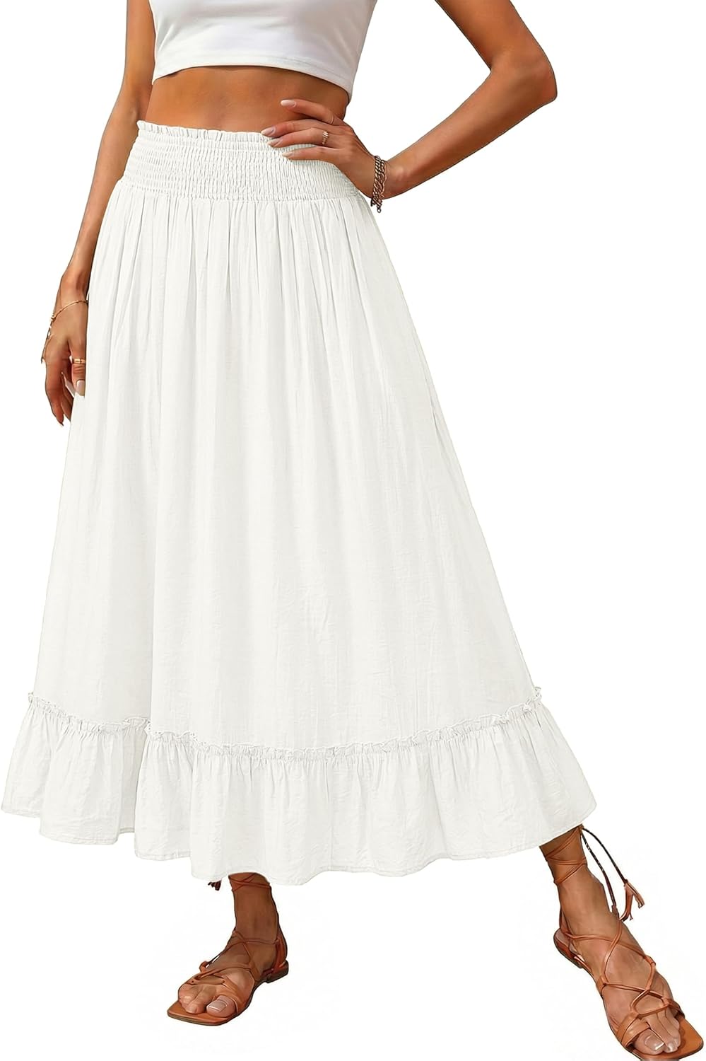 luvamia Maxi Skirts for Women Trendy Flowy Ruffle Smocked Waist A-line Boho Swing Long Skirt with Pockets Beach Vacation