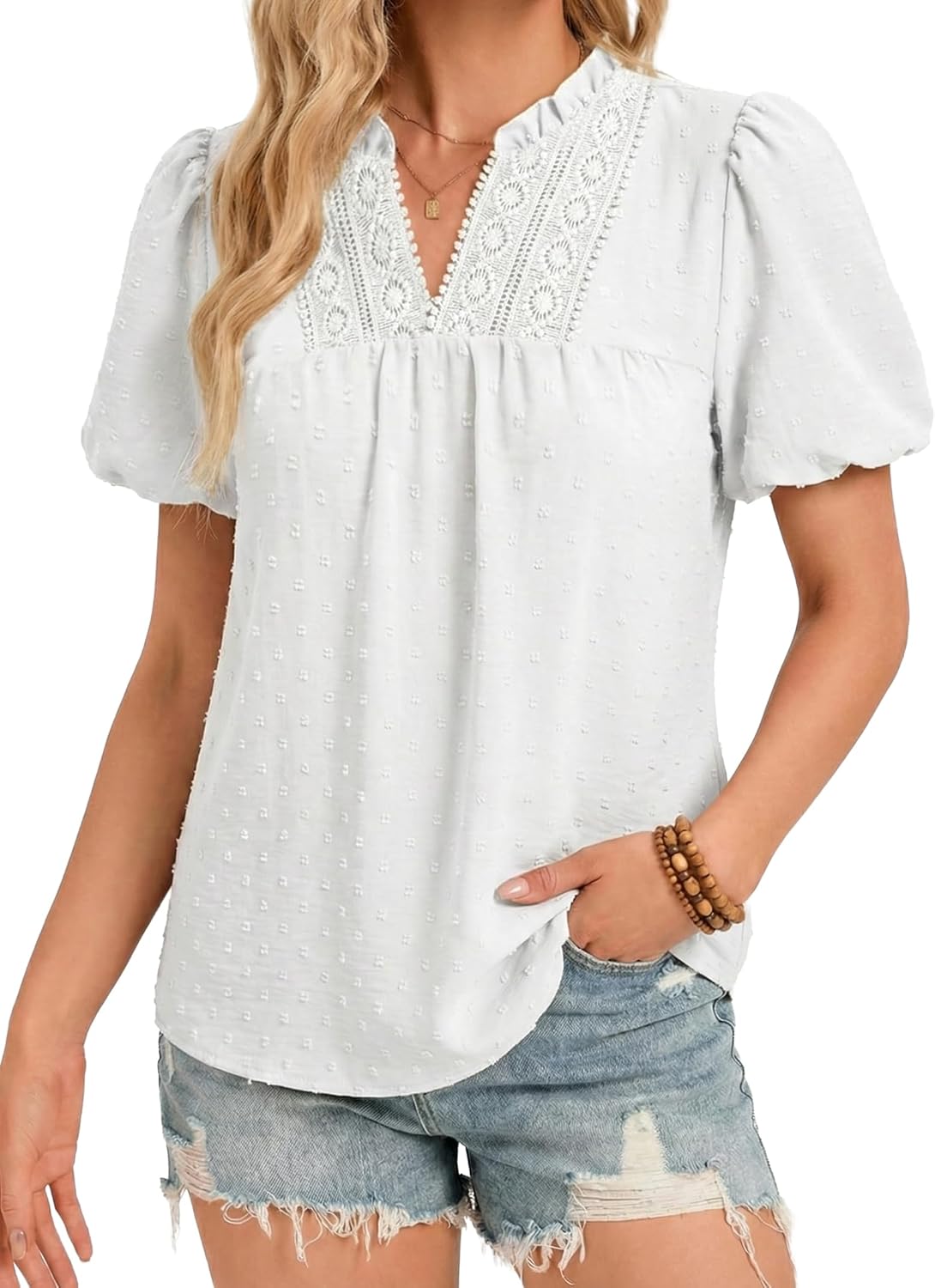 Funlingo Womens Boho Tops Summer Short Puff Sleeve V Neck Blouses Dressy Casual Flowy Swiss Dot Lace Crochet Shirts