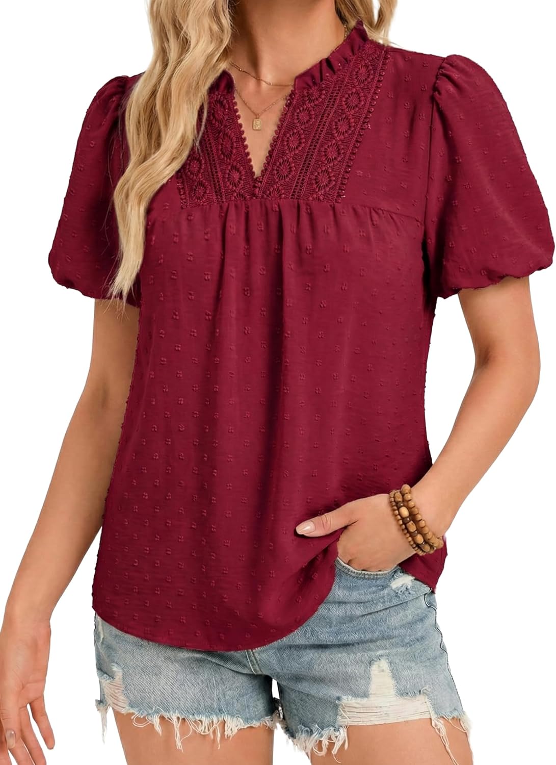 Funlingo Womens Boho Tops Summer Short Puff Sleeve V Neck Blouses Dressy Casual Flowy Swiss Dot Lace Crochet Shirts
