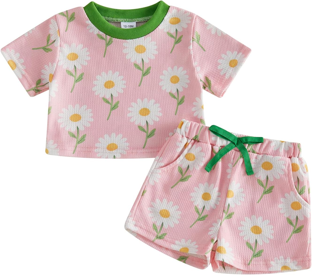 Lamuusaa Toddler Girl Outfits Short Sleeve Floral Crewneck T-shirt and Jogger Shorts 2Pcs Baby Girl Summer Clothes 6M-4T