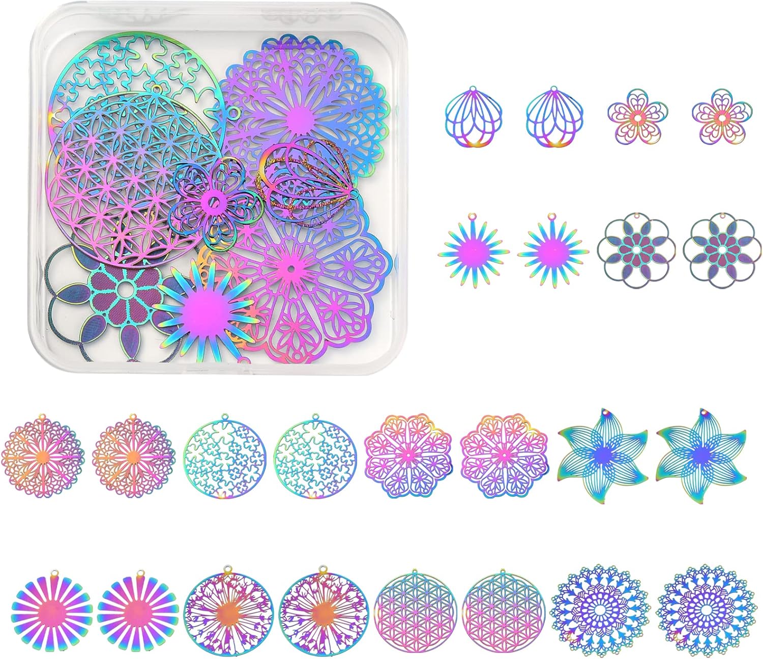 24 Pieces Flower Filigree Charm Pendant Rainbow Stainless Steel Charm Multi-color for Jewelry Necklace Bracelet Earring Making Crafts