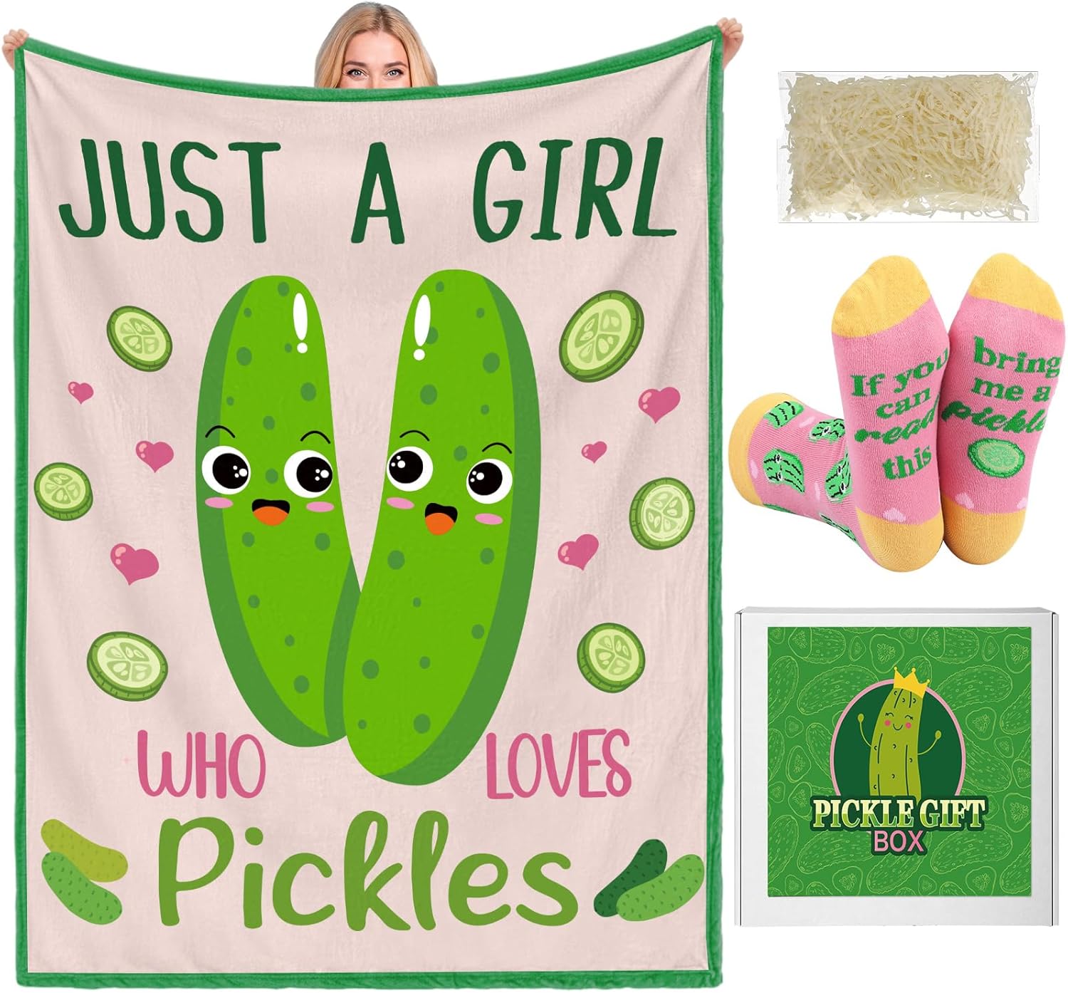 - Interesting Pickle Theme: these pickle gifts are packed with charm! The blanket has the lovely phrase " Just A Girl Who Loves Pickles", and the dill socks add playful pickle elements; It's the most charming way to show off a love for pickles, truly a standout pickle lovers gift