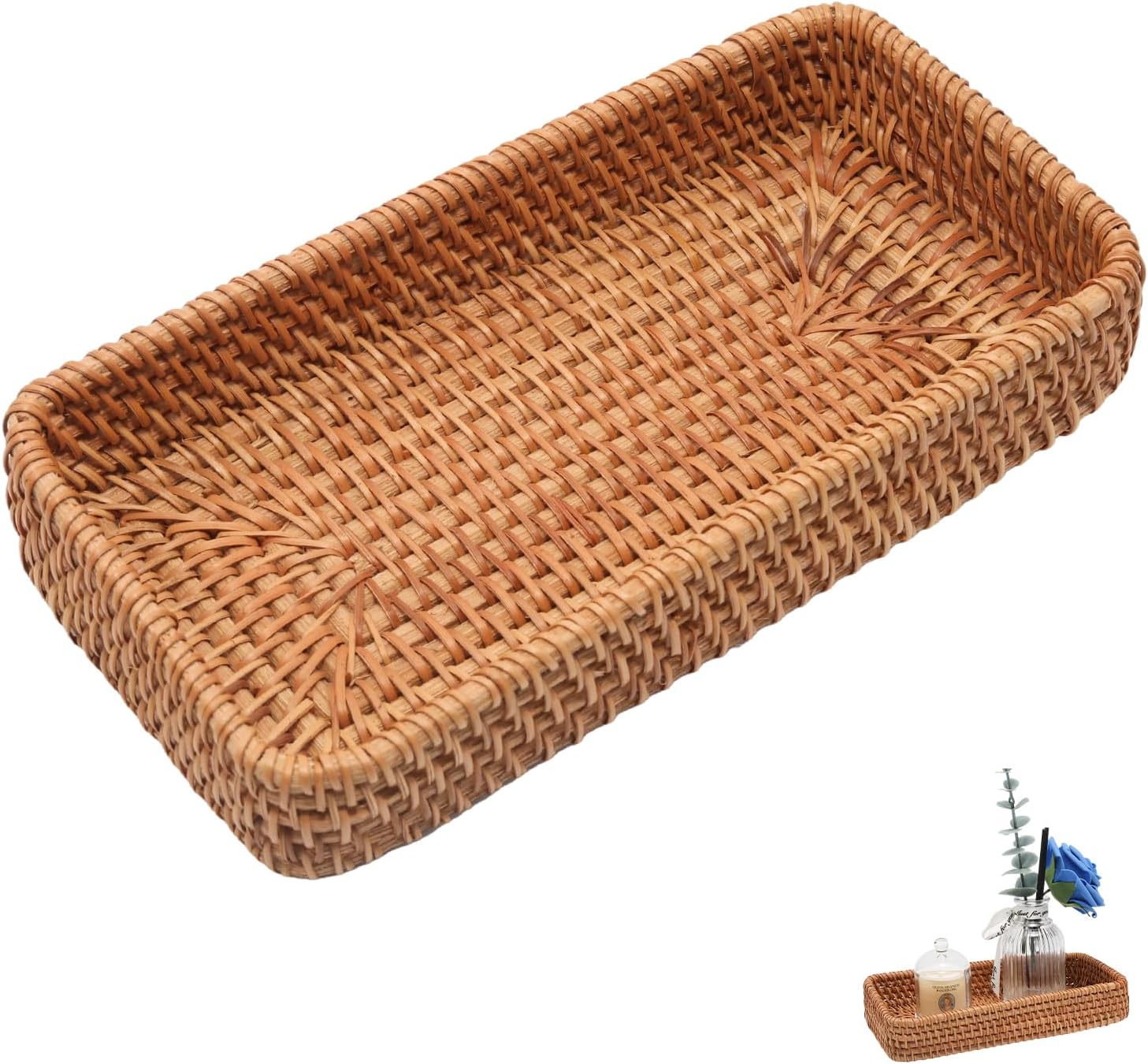 - Size and Package: There is a 8.3"x4.3"x1.6" small woven tray in the package, this small wicker basket not only beautifies your space but also embodies sustainability and style