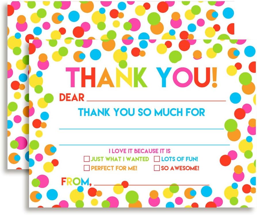 Polka Dot Rainbow Theme Kids Birthday Party Thank You Cards, 10 Fill-In 4x5.5 Notes with Envelopes, Colorful Neon Fun Design for Child Appreciation, Made in USA by Amanda Creation