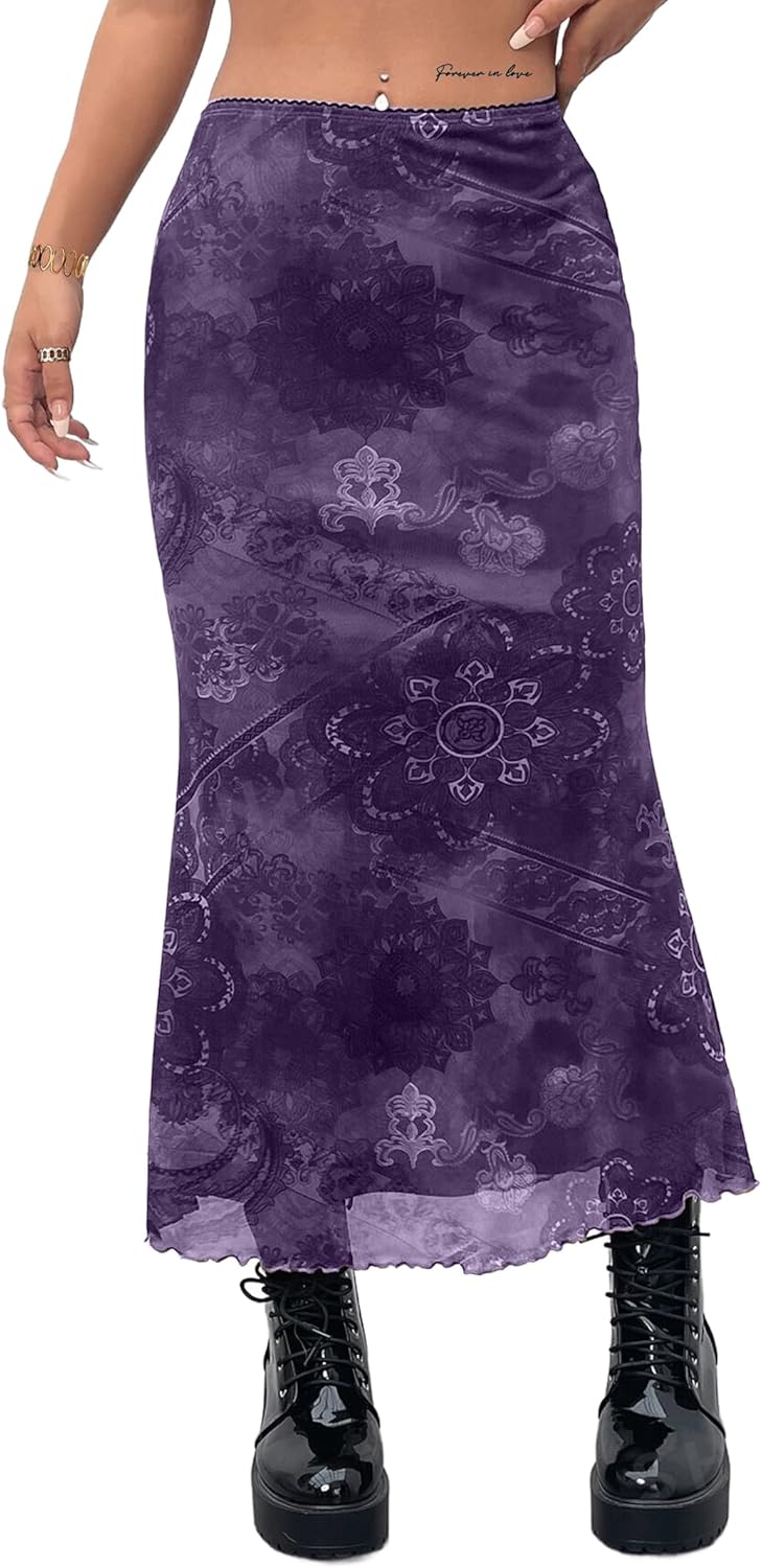 Avanova Women Boho Floral Mesh Long Skirts Elastic High Waisted Mermaid Hem 90s Grunge Maxi Skirt Purple X-Large