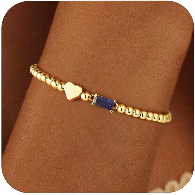 Valentines Gifts for Her - Dainty Birthstone Bracelets for Women Elastic 14K-Gold-Plated Bead Bracelet Trendy Heart Friendship Bracelets Stack Birthday Jewelry Gifts for Women