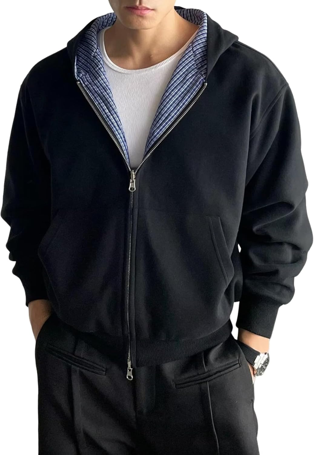 RICHTRUE Y2k Plaid Zip Up Hoodie Men Women Reversible Graphic Sweatshirt Emo Grunge Jacket Fall Winter Baggy Streetwear