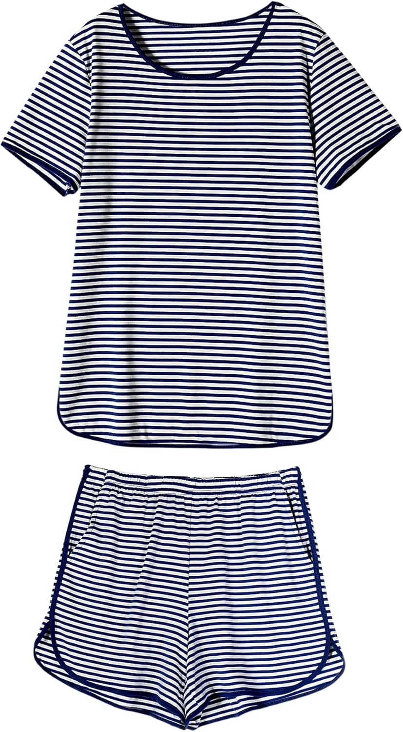 Rapbin Womens Pajama Sets 2026 Spring Summer Ladies Striped Short Sleeve 2 Piece Shorts Set Crew Neck Split Soft Cozy Pjs
