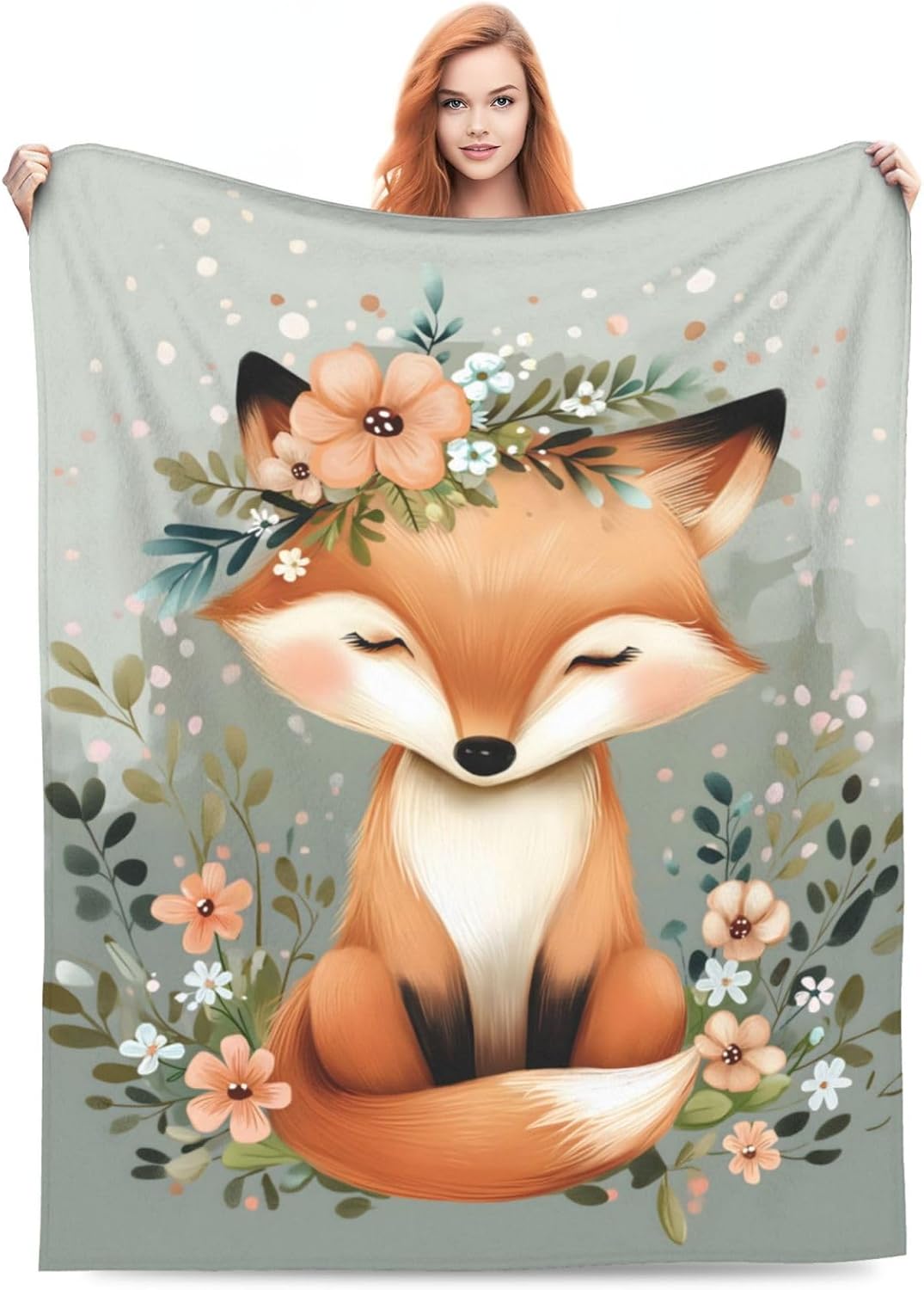 Cute Flower Fox Blanket Gifts for Kids Girls Animal Flannel Throw Blankets Soft Comfy Lightweight for Home Decor Couch Bed Sofa 60x50 Inches