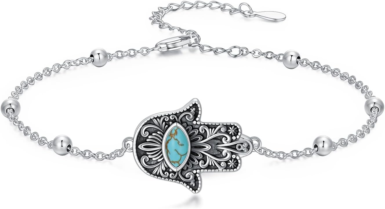 Real Turquoise Hamsa Bracelet 925 Sterling Silver Hand of Fatima Evil Eye Adjustable Link Bracelets Jewelry for Women
