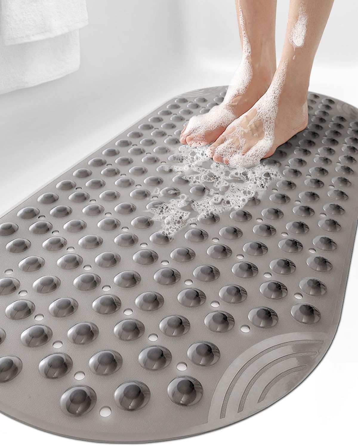 DEXI Bathtub Mat Non Slip 16x35, Shower Floor Mats for Bathroom Bath Tub, Washable Oval Bathmat with Suction Cups and Drain Holes, Clear Gray