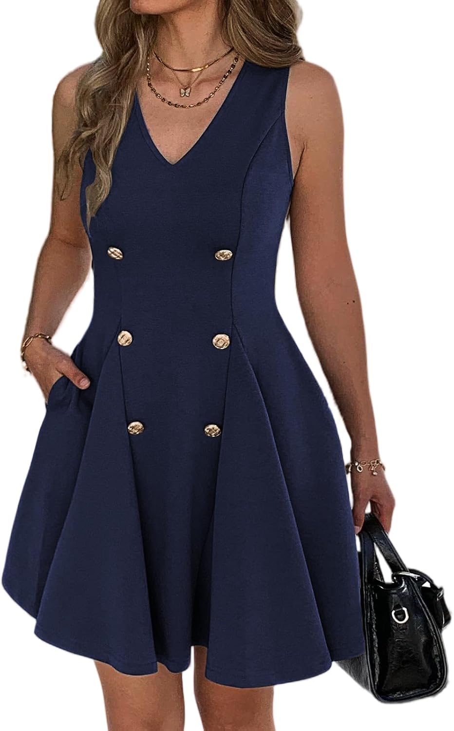 Work Dresses for Women Summer Business V Neck Sleeveless Buttons Short Flare Dress with Pockets Elegant Office Outfit