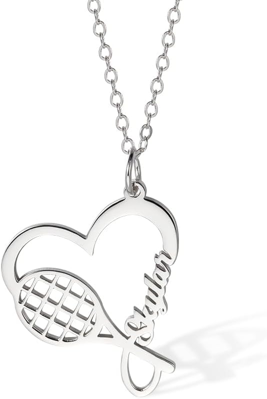 Heart Tennis Racket Necklace Sterling Silver Personalized Name Tennis Racket Pendant Necklace Birthday Team Gift Valentine's Day for Women Sports Tennis Lover Mom Wife Daughther