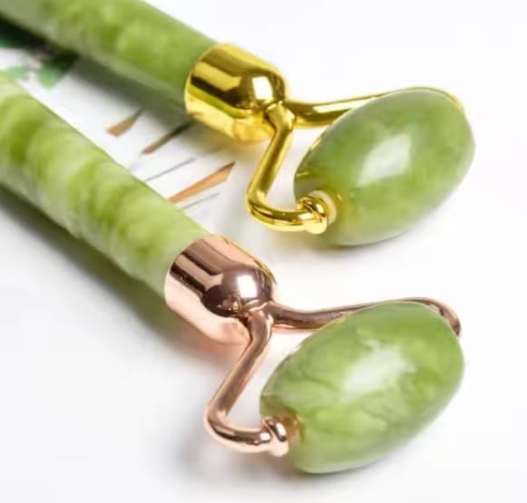 - 100% natural jade stone. Handcrafted from authentic jade for a cooling, soothing facial massage reduces puffiness and dark circles, helps depuff under eye bags and brighten skin for a refreshed look. Dual head roller design, large roller for forehead cheeks and neck. Small roller for delicate areas like the eyes. Boost circulation and lymphatic drainage promotes natural skin detox, reducing inflammation and promoting firmness. Enhances skin care absorption works perfectly with serums and moisturizers to maximize their benefits. Bonus Gua Sha tool included. Designed for deeper facial massage, sculpting and relieving muscle tension. Suitable for all skin types