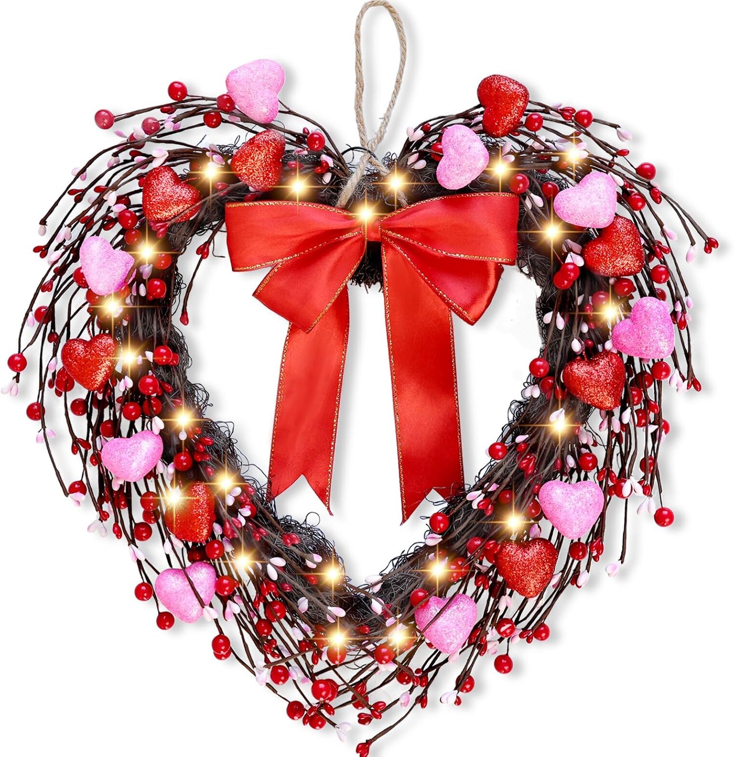 - Romantic Valentines Wreath: This 17-inch heart shaped wreath features sparkling 3D hearts, vibrant red berries, and an elegant bow. Complete with a warm LED light string (batteries not included) and sticky hook for easy hanging. Create a warm and romantic atmosphere