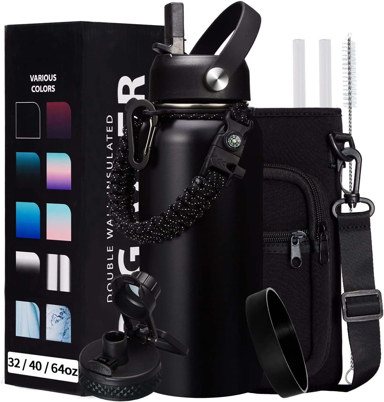 32-40-64OZ Stainless Steel Water Bottle - Black Water Bottle with Straw & Spout Lid, Paracord Handle & Bottle Sleeve, Insulated Vacuum Water Flask Double-Wall Metal Thermo Cup Canteen for Gym School