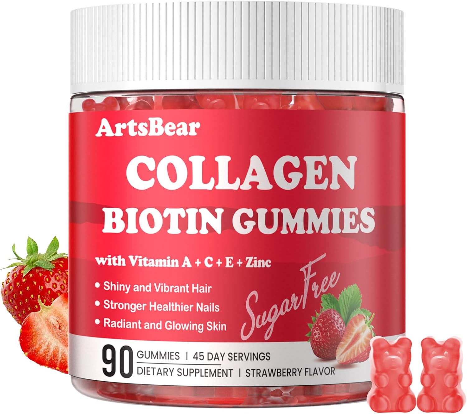 Collagen Gummies with Vitamins C, A, E, Zinc, and Biotin – Hydrolyzed Collagen Peptide Supplement for Hair, Skin, and Nails – Vegan, Sugar-Free, Strawberry Flavor – 90 Gummy