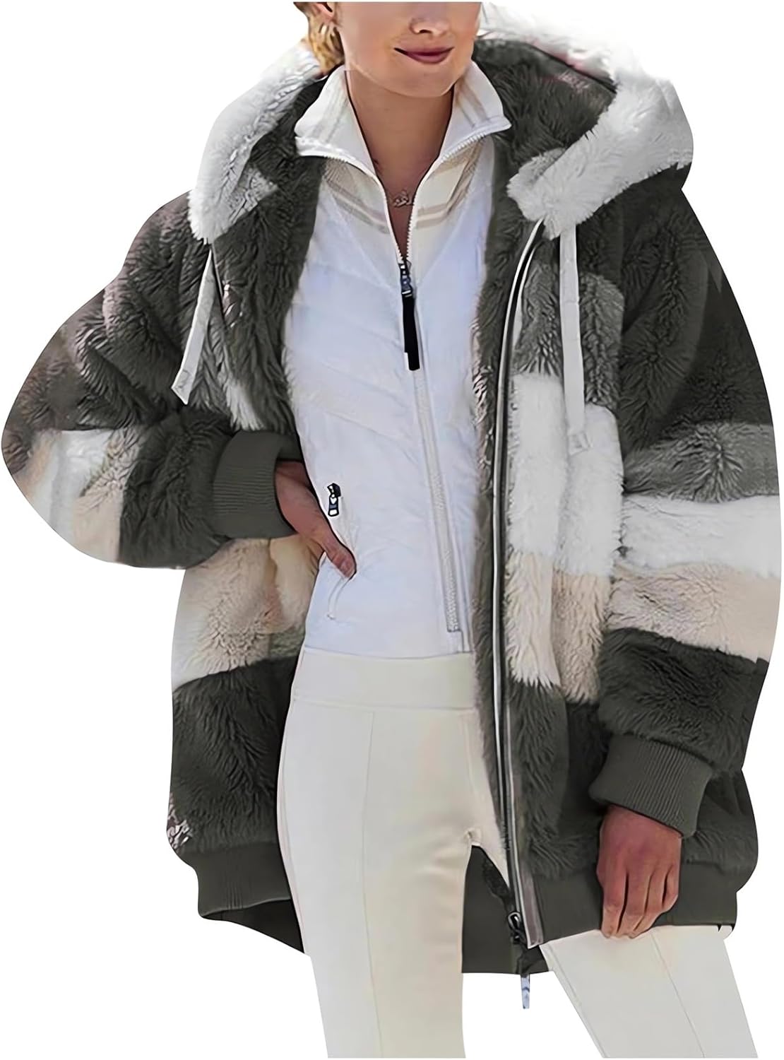 2024 New Rcontrasting Lamb Wool Padded Coat Sherpa Hoodie Lined Jacket Women Faux Fur Shearling Fleece Zip Shacket