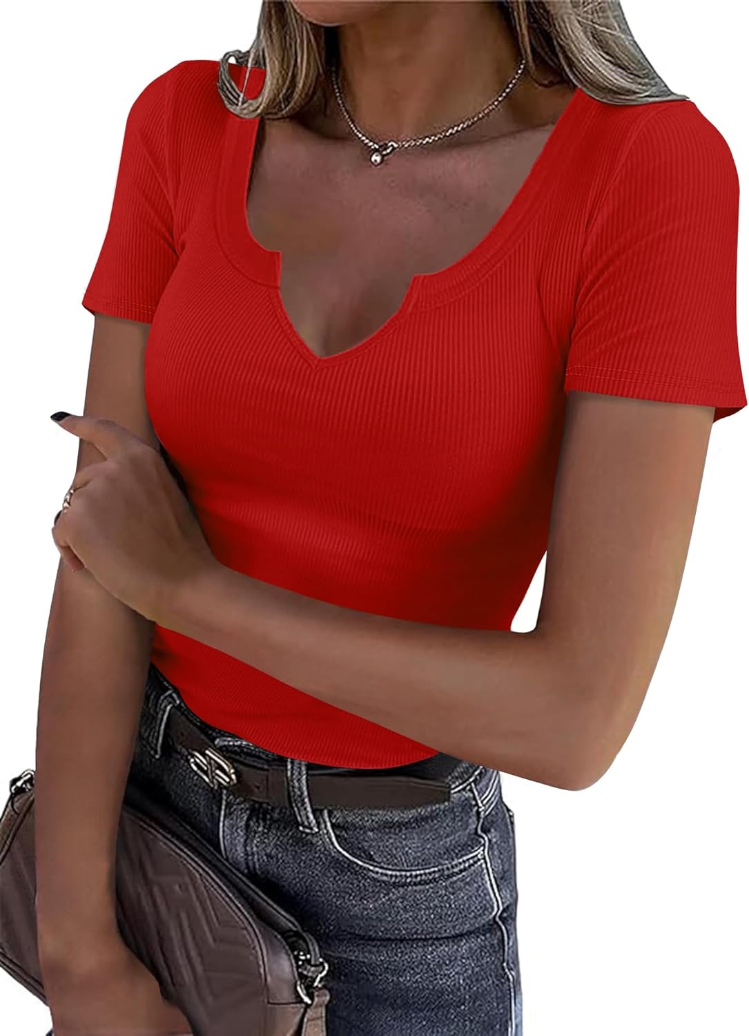 Roselux Women V Neck Ribbed Short Sleeve Shirt Fitted Basic Henley Knit Top