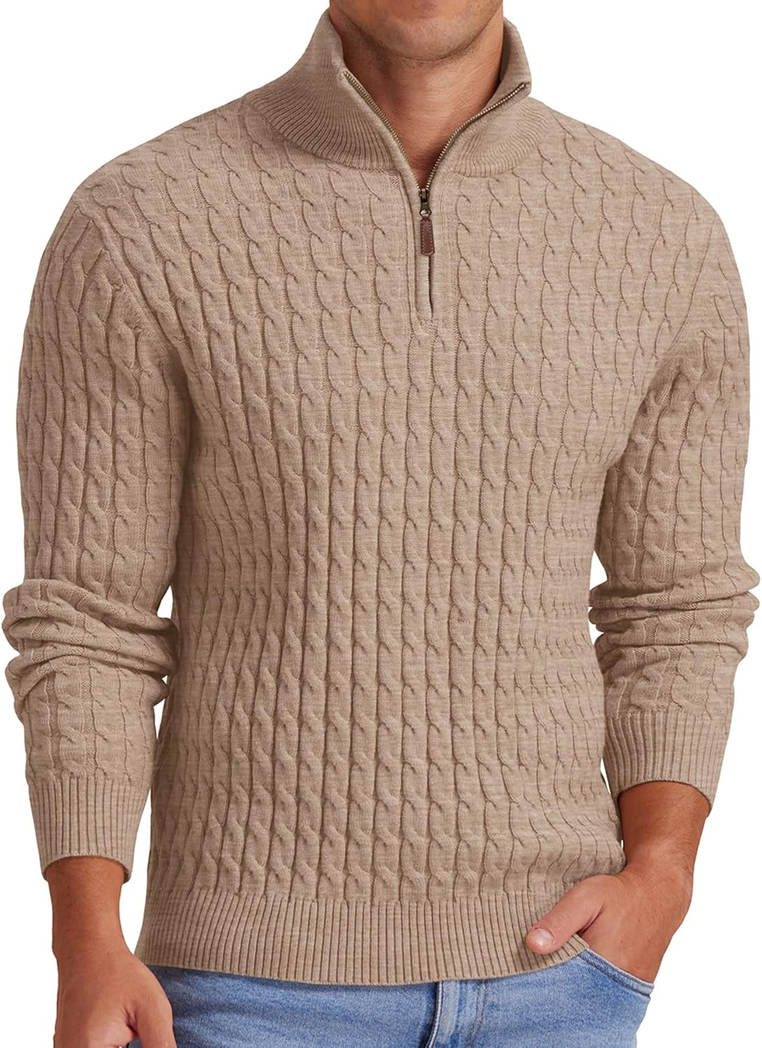 Askdeer Men's Cable Knit Sweater Quarter Zip Sweater Mock Neck Polo Sweater Casual Pullover Sweater with Ribbing Edge