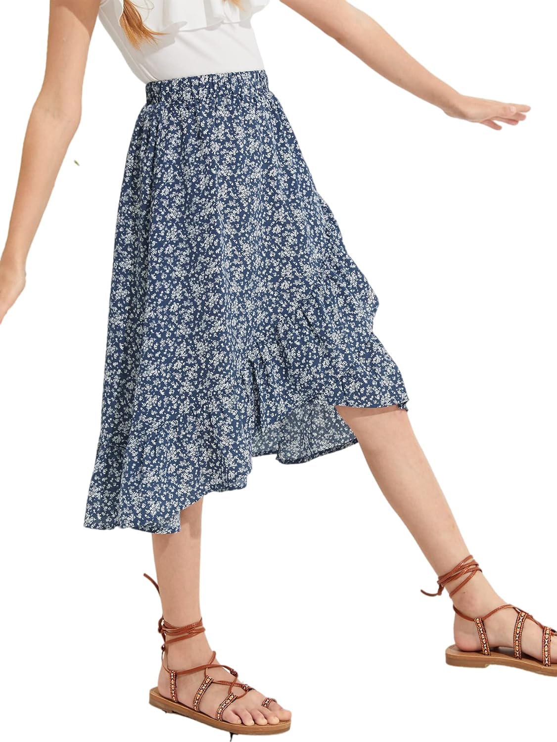 OYOANGLE Girl's Boho Chiffon Floral Print Ruffle Hem Asymmetrical Elastic High Waist Flowy Midi Skirt