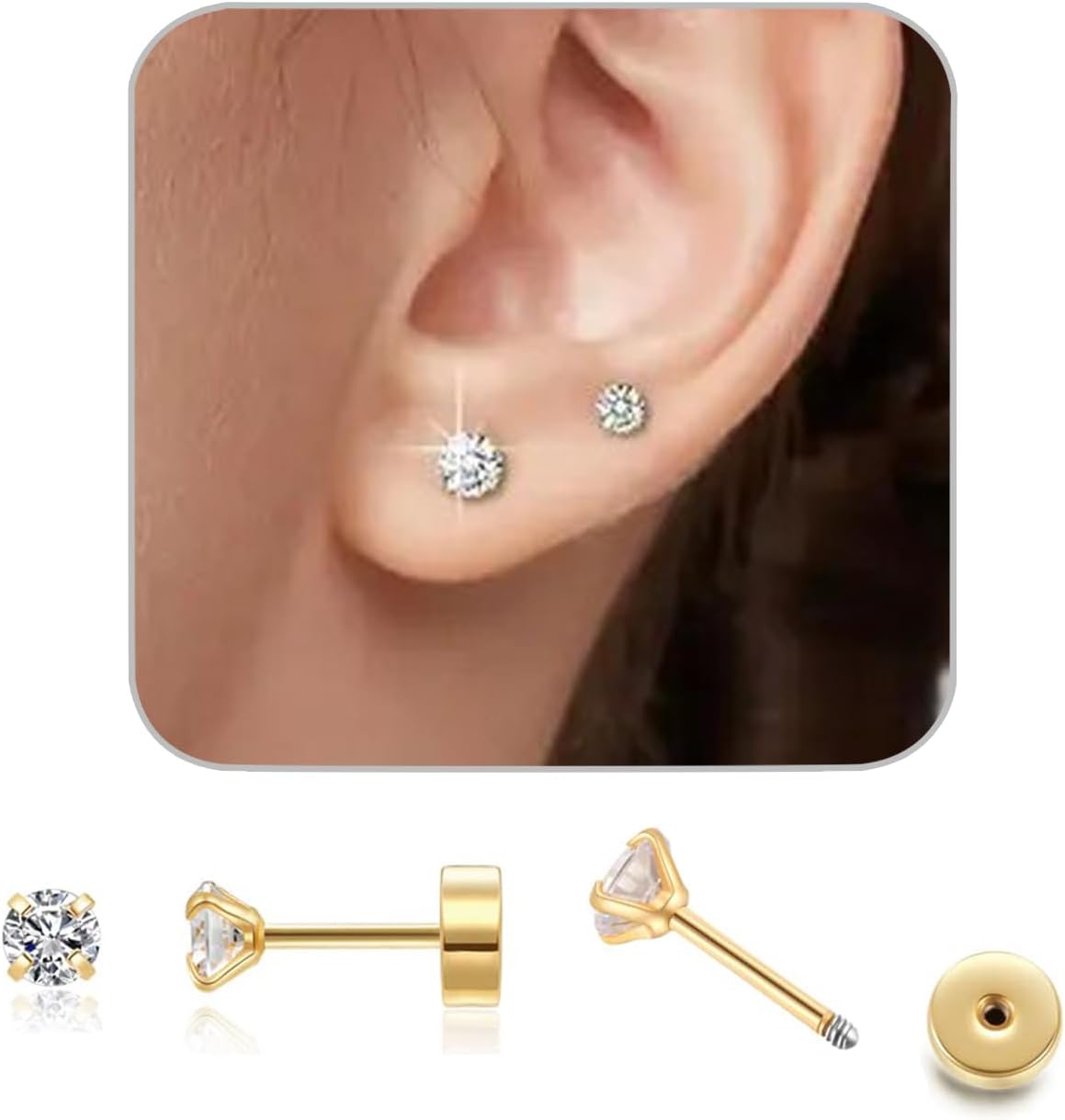 Stud Earrings Set, Flat Back Earrings for Women 14K Gold Hypoallergenic Cartilage Earring 3/4/5mm CZ Cubic Zirconia Earrings Stud for Tragus Cartilage Earlobe Piercing Jewelry Women Gift