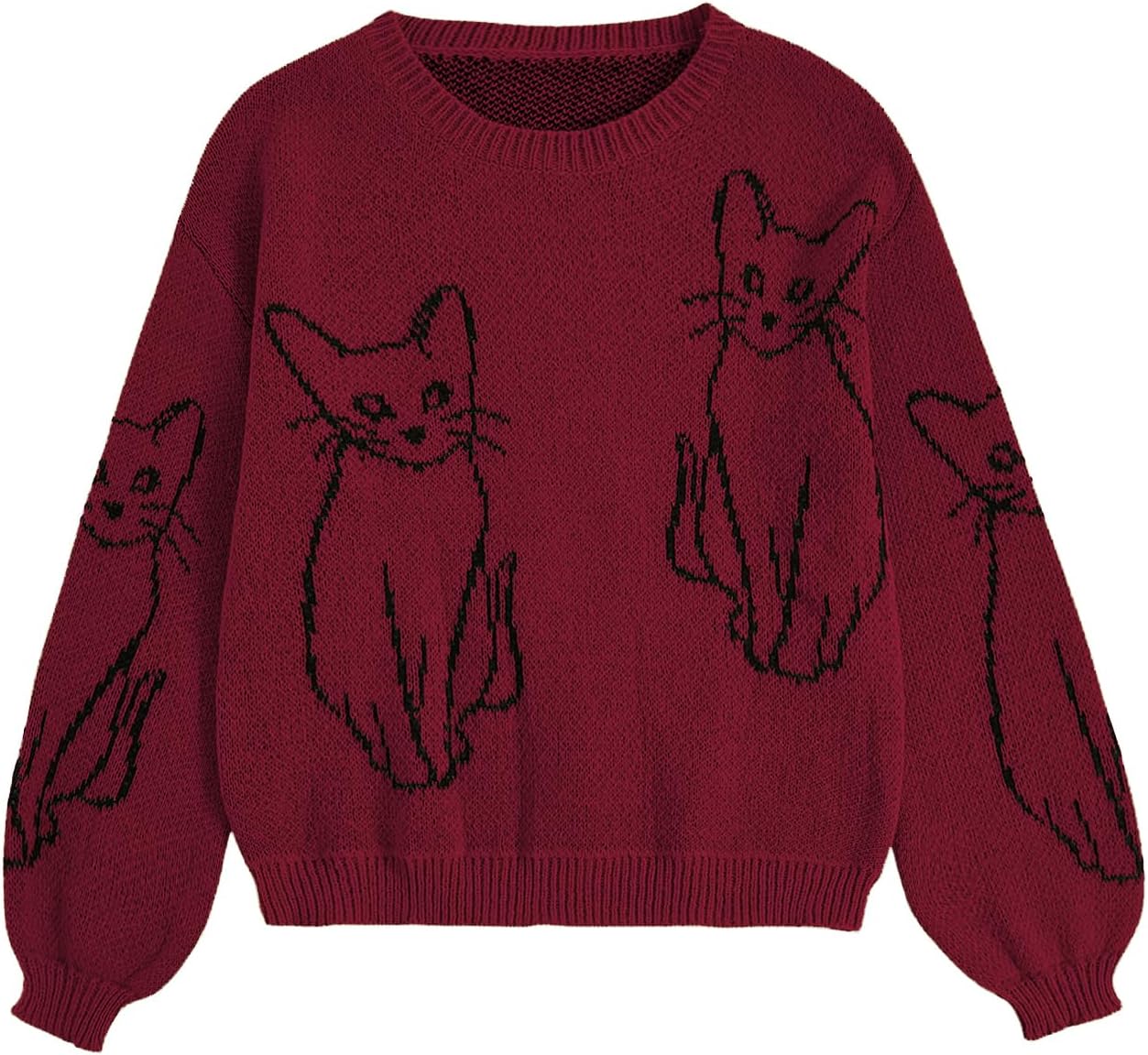 WDIRARA Women's Cartoon Cat Bishop Long Sleeve Round Neck Sweater Drop Shoulder Pullover Tops