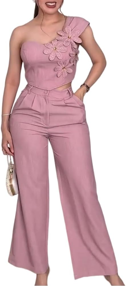 CHICME Women’s 2 Pieces Outfit One Shoulder Sleeveless 3D Floral Applique Crop Top and High Waist Wide Leg Pants Set
