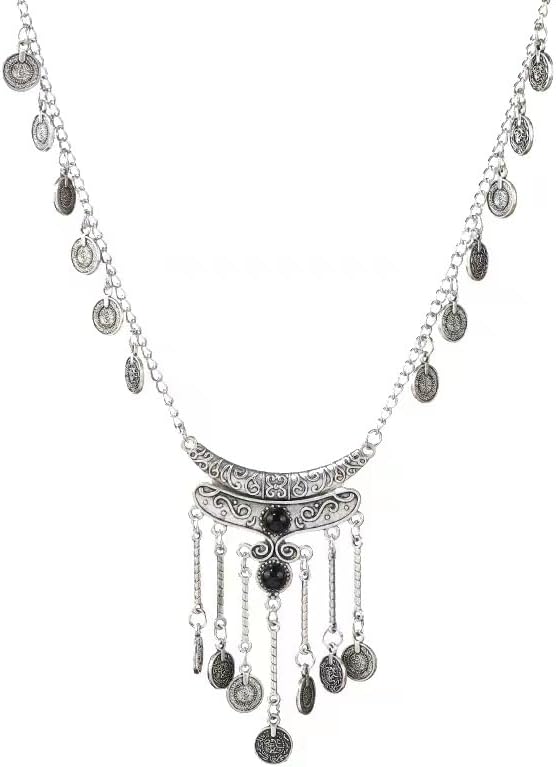 Bohemian Indian Engraved Coin Tassel Ancient Silver Collar Necklace for Women Retro Ethnic Black Gemstone Coins Pendant Tribal Vintage Choker Statement Boho Gypsy Costume Accessories