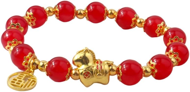 Chinese New Year of The Horse Natural Stone Bracelets Multi-colored Horse Stone Beaded Stretch Bracelet Gold Zodiac Horses Good Luck Amulet Blessing New Year Bracelet Gifts