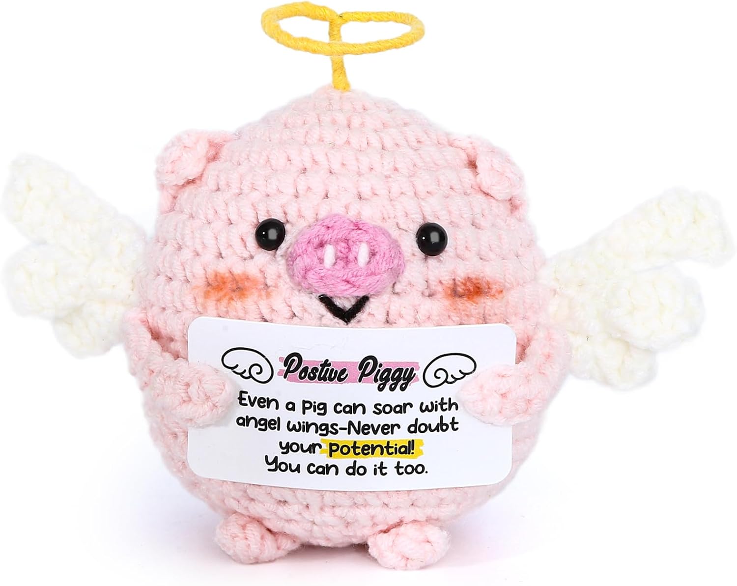 - Funny Crochet Animal Piggy: Our crochet piggy is always smiling and holding a card with encouraging words, put on the desktop can give confidence and positive energy from time to time, provide emotional value, when you meet difficulties look at it, it can relieve anxiety and give you energy: believe in yourself, you can do it.