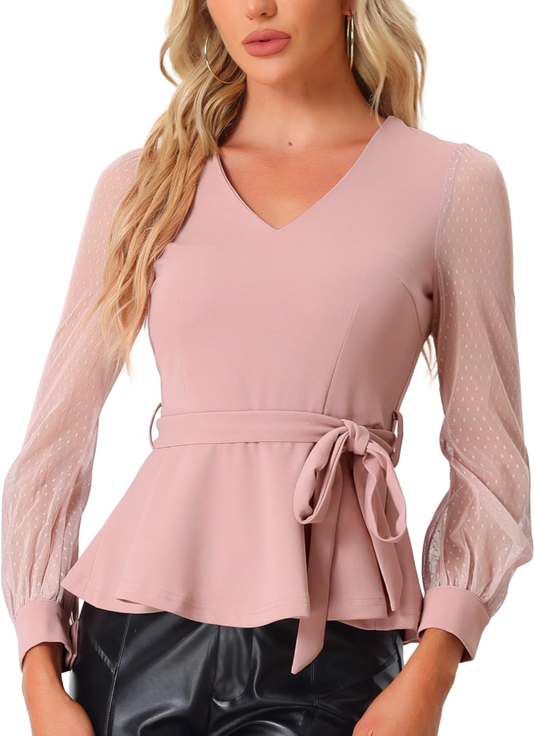 Allegra K Tie Waist Peplum Top for Women's Ruffle Hem Party V Neck Christmas Mesh Long Sleeve Blouse