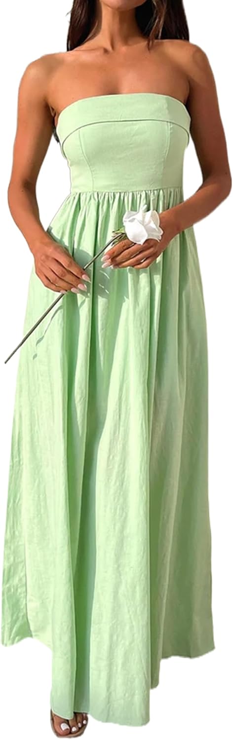 Women Summer Strapless Maxi Tube Dress 2024 Trendy Solid Pleated Flowy Dress Wedding Guest Maxi Dresses Party Club