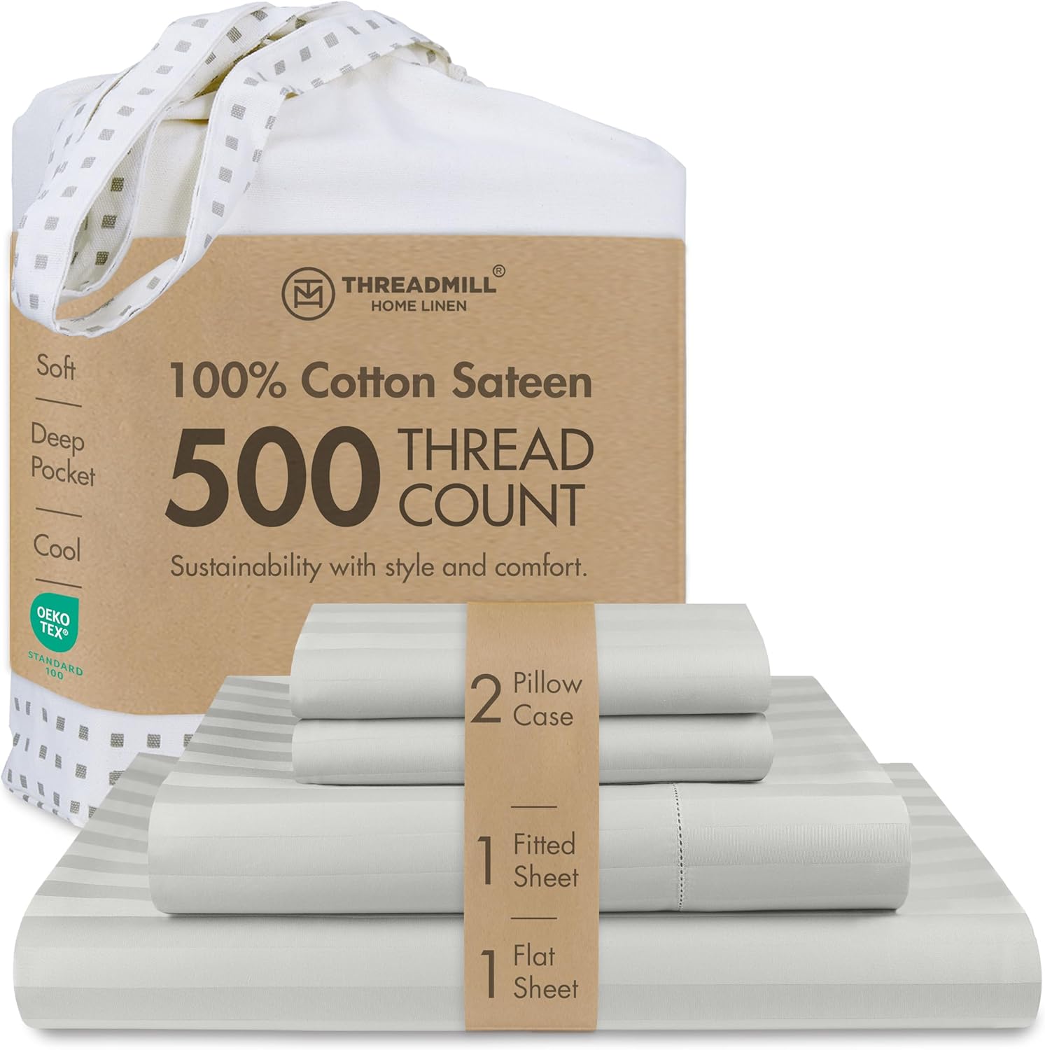 Threadmill 500 Thread Count Full-Size Damask Stripe, 4 Pc Luxury Cotton Sheet Set, Breathable Light Grey Sheets with 16" Elasticized Deep Pocket, 2 Pillowcases & Free Tote Bag