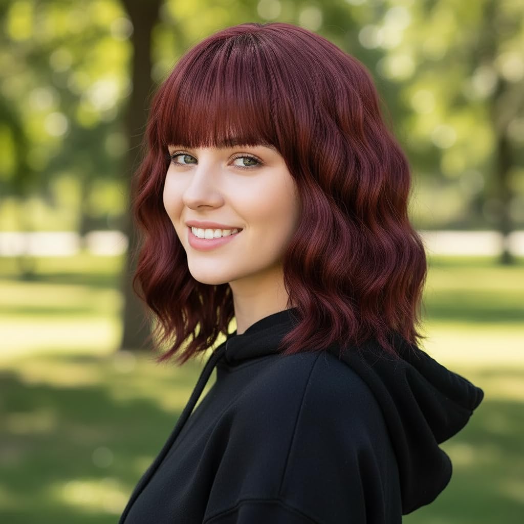 - 【Unique Bob Wavy Wig Style】:Burgundy Short Bob Wigs with Bangs, looks more natural and fluffy,Medium Length Loose Wavy Wigs.Hair Bang:5inch,can be cut according to your face.