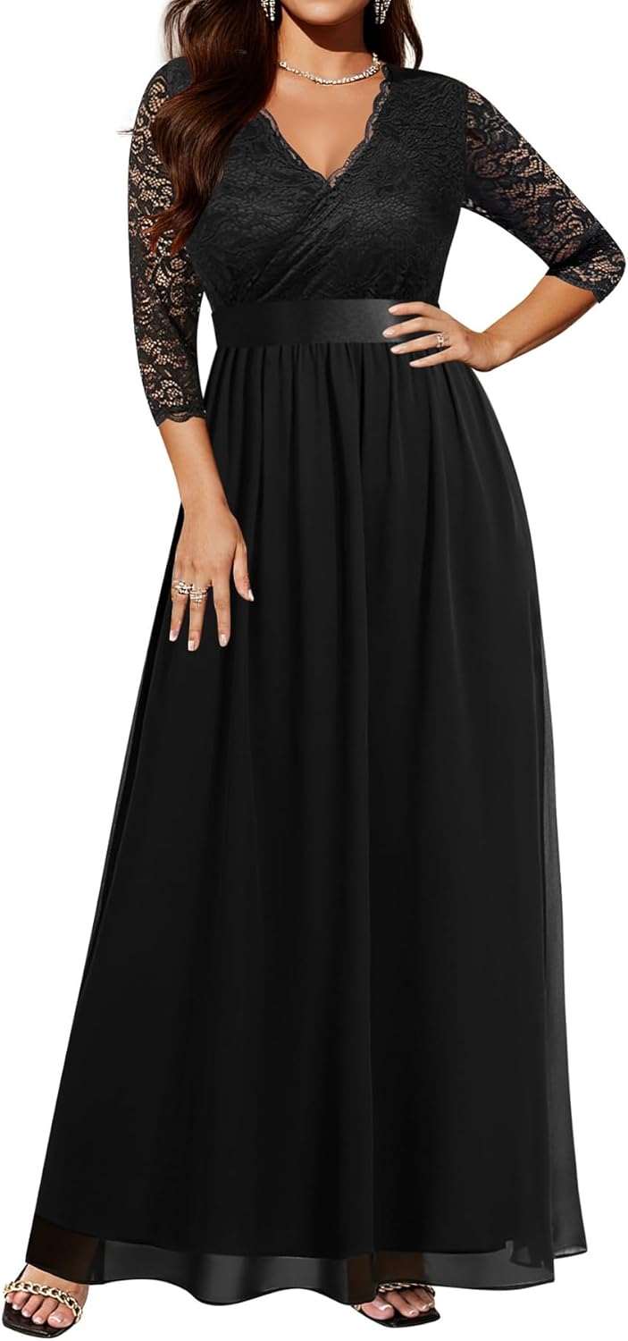 Pinup Fashion Wedding Dresses for Bride Plus Size - Formal Evening Gown Wrap Neck Lace Chiffon Long Dress