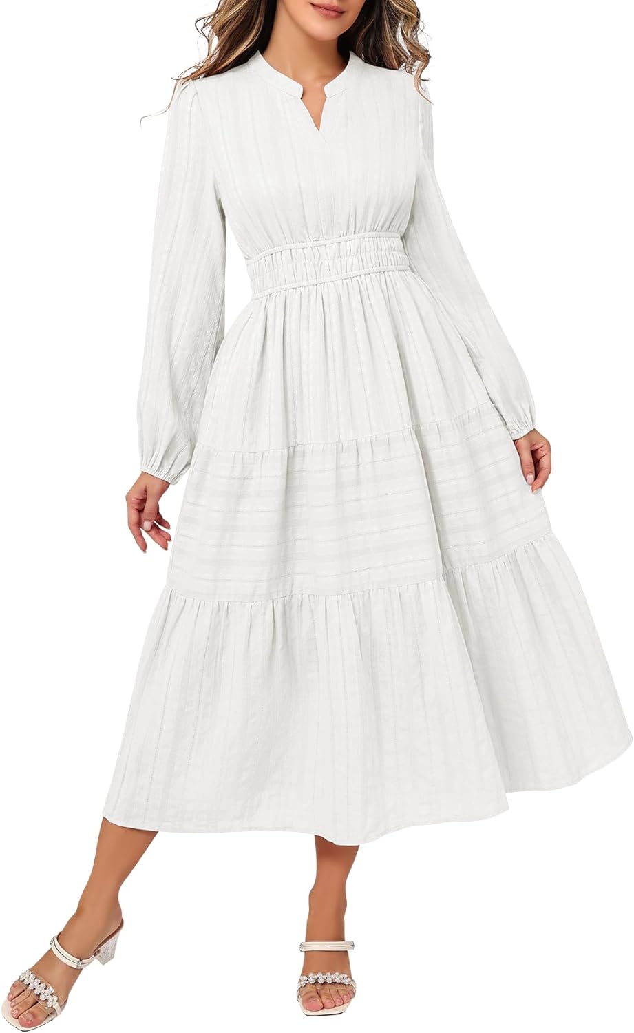 Fall Dresses for Women Long Sleeve Elastic Waist Soft Maxi Wedding Guest V Neck Dress with Pockets 2025 Casual White Small