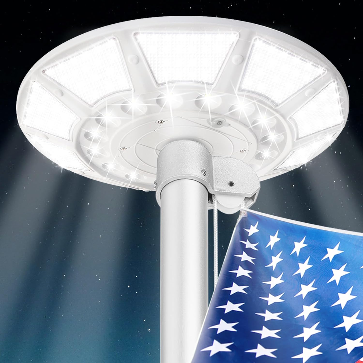 - 【100% Flag Coverage】The flag pole solar light unique 45 degree panel+new upgraded 566 super bright high power LEDs made. 6000 lumens high brightness and large beam angle design can provide the brightest and most coverage for the flag in all directions.566 LED lights are used to cast light downwards,making its flag fully displayed. At night,your national flag will be the brightest star in the night sky.