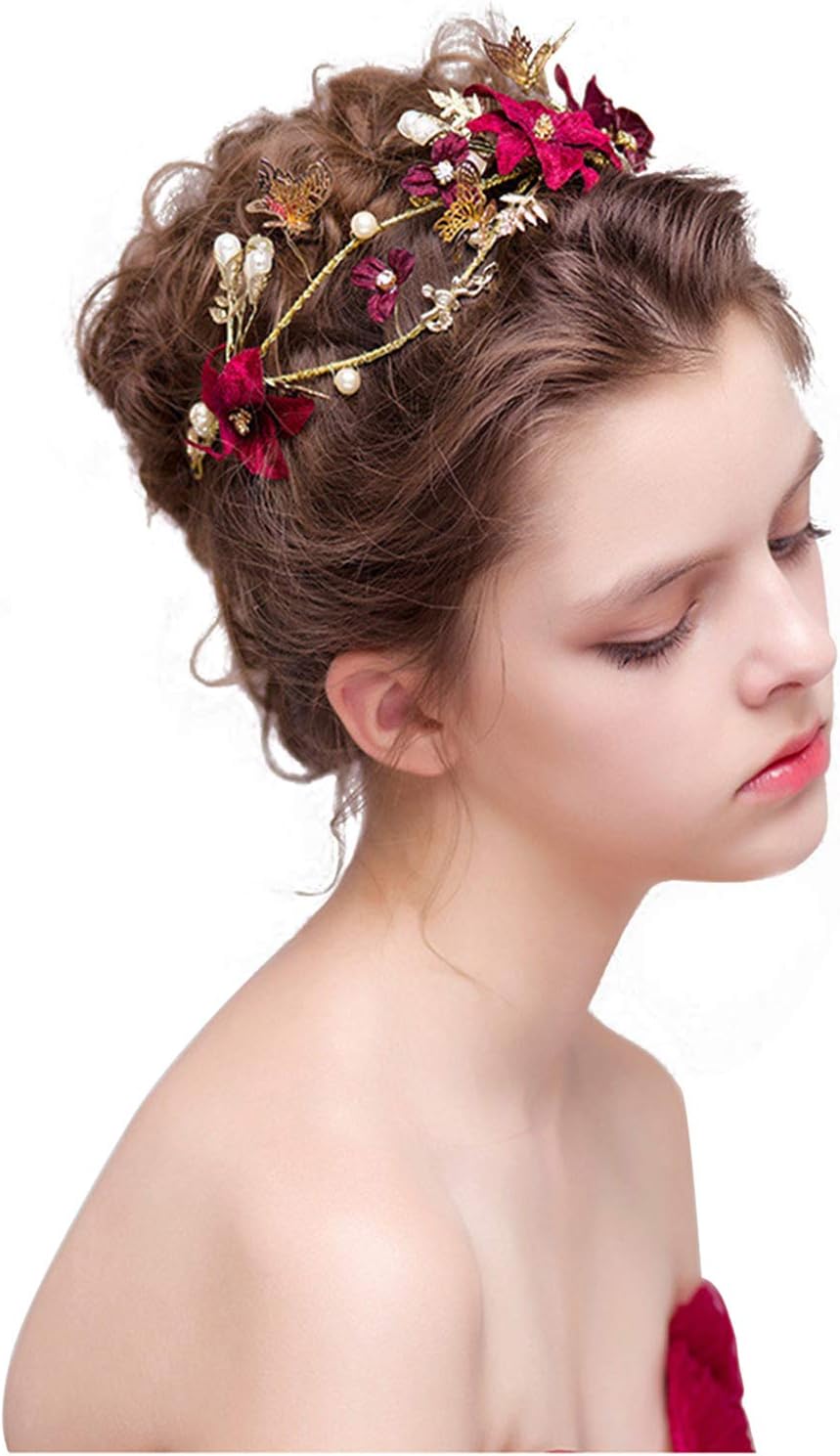 Wedding Headpiece Red Flower Gold Butterfly Hairbands Wedding Tiara Pearl Headbands Bridal Hair Bridesmaid Jewelry Accessories (B)
