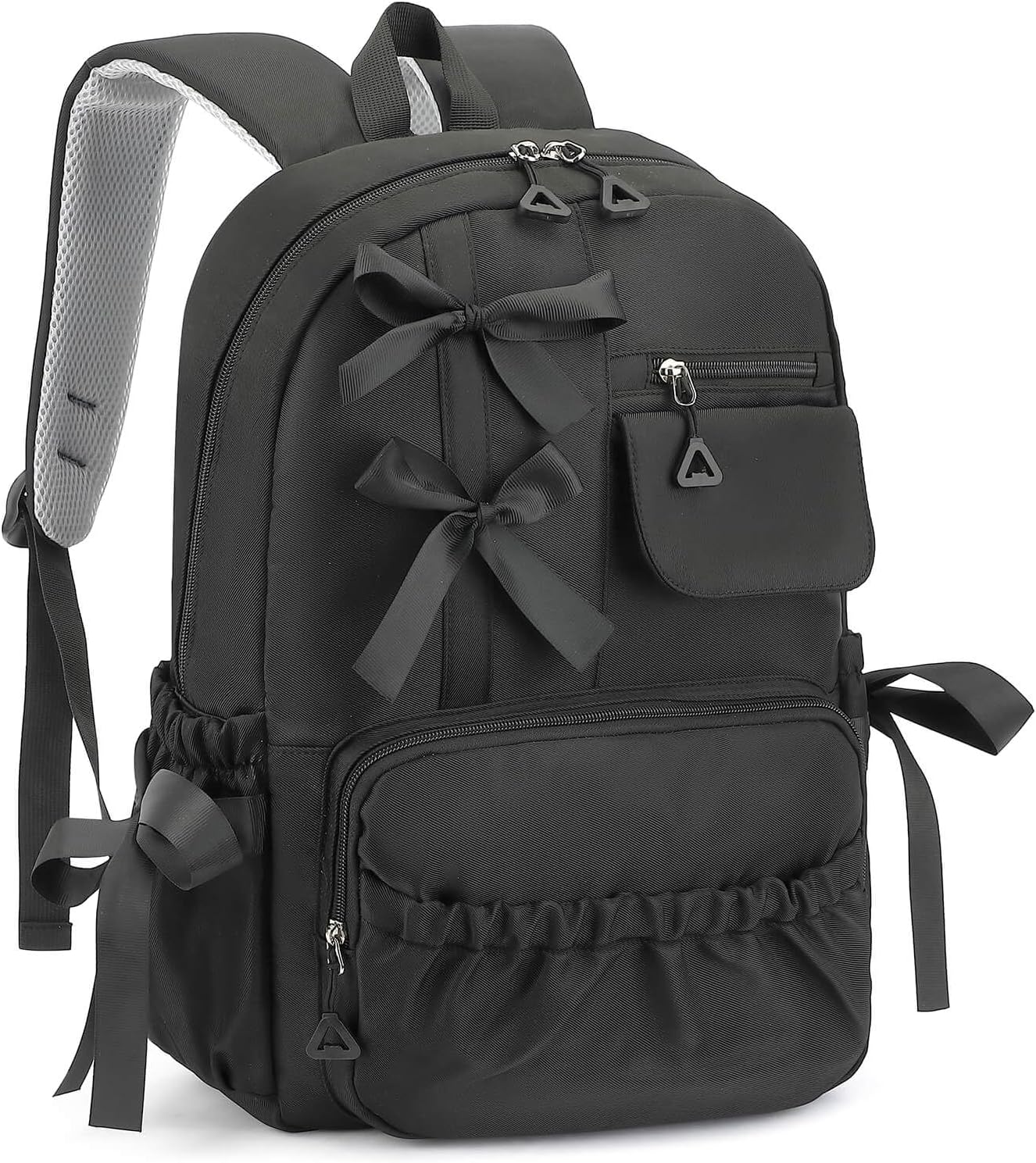 - Multiple Pocket Design: This cute bow-not backpack measuring 13’’ x 5.5’’ x 17’’. This aesthetic backpack has multiple functional pockets for organization. Included 1 main pocket with 2 small inner pockets for your small items and a protected divider for papers or laptop, 4 external front pockets, 1 hidden zipper back pocket and 2 side pocket for your water bottle