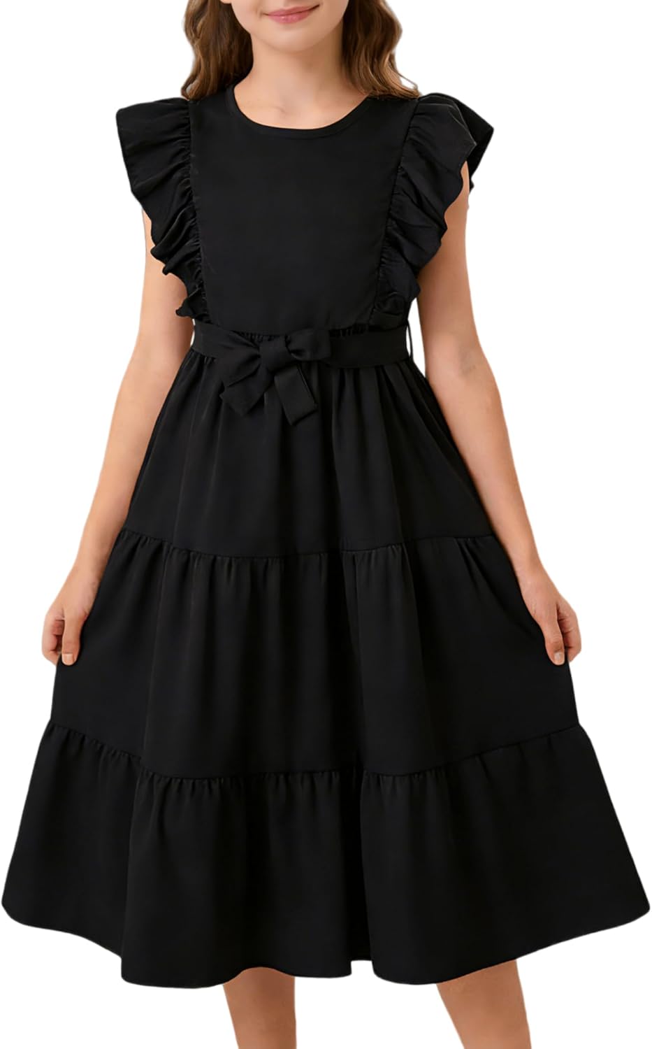 Girls Summer Dresses Ruffle Sleeve Dress A Line Swing Belted Casual Solid Color Party Dress 6-14 Years