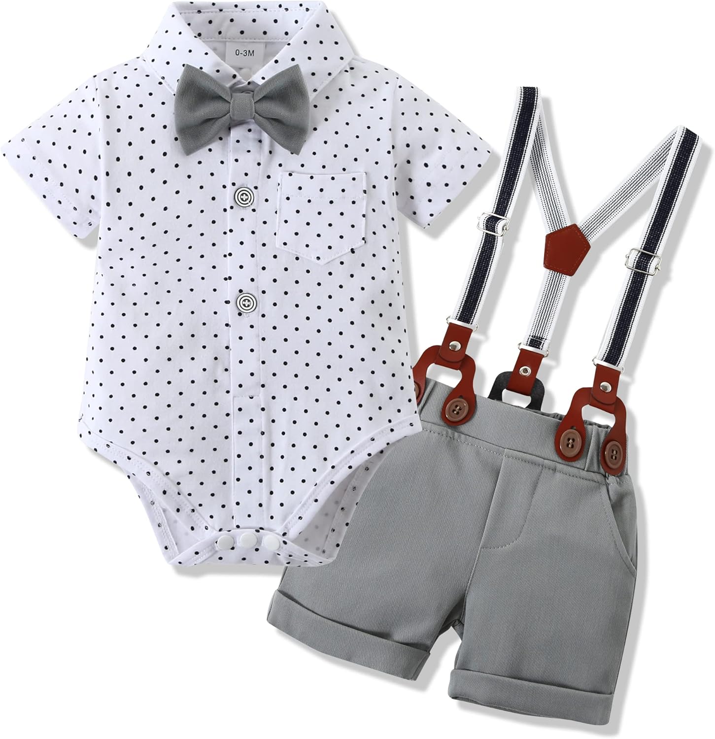 WESIDOM Baby Boy Clothes Suit 0-24 Months Gentleman Outfits, Short Sleeve Dress Romper+Bowtie+Detachable Suspender Shorts Set
