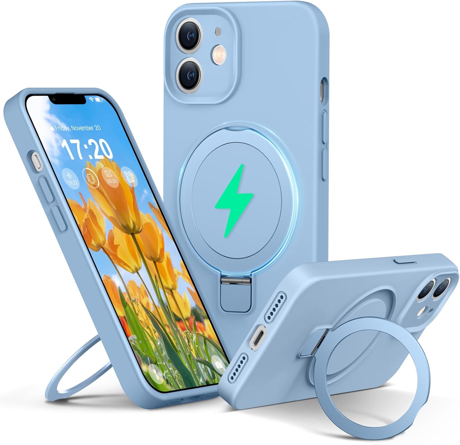 Liquid Silicone Case for iPhone 12 with Magnetic Ring Stand, Upgraded Camera Lens Protection, Mil-Grade Drop Shockproof, Soft Anti-Scratch Microfiber Lining Silicone Case (Azure Blue)