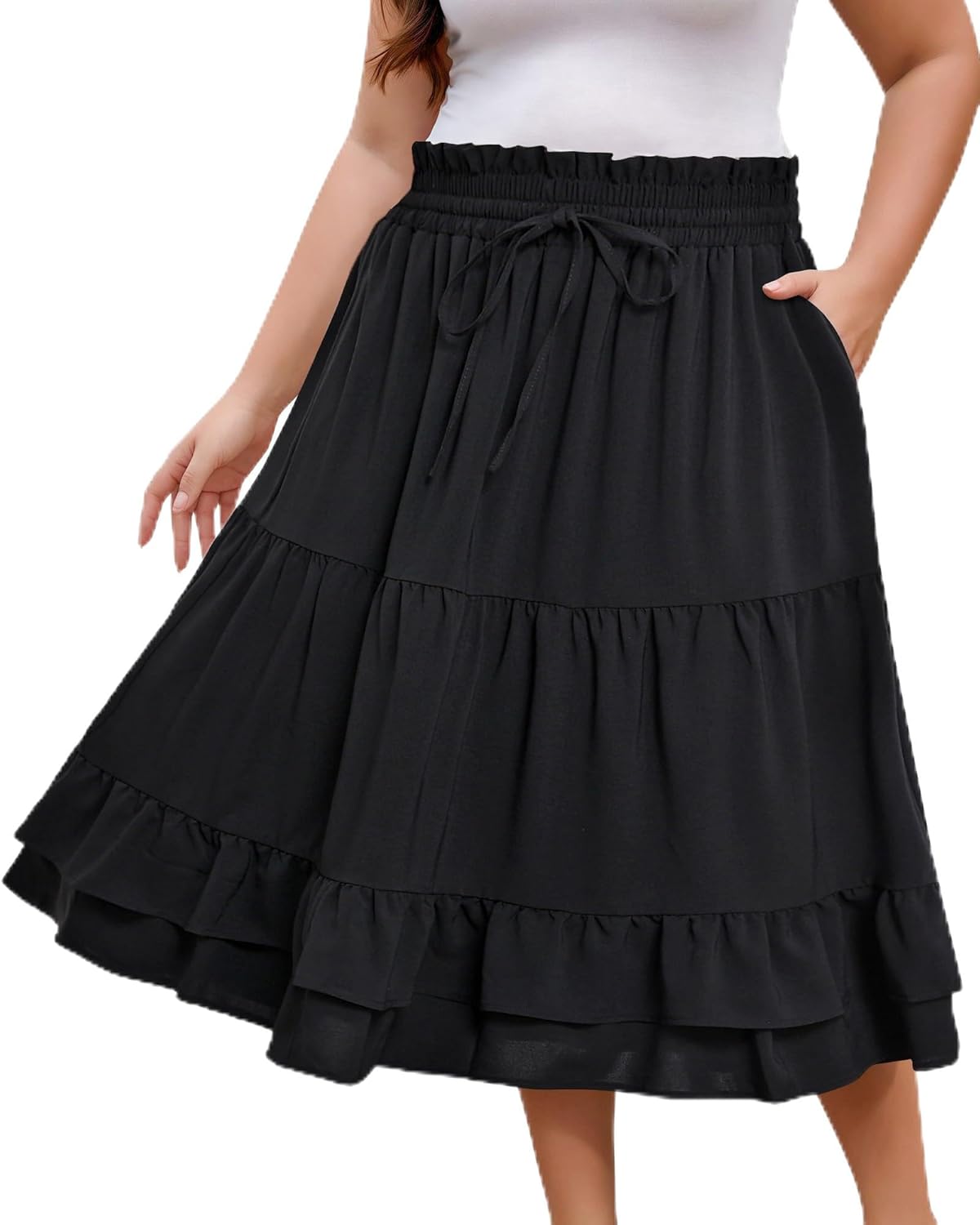 LOUSGUTA Women's Midi Skirt Flowy Ruffle Skirts Midi Length A-Line Layered Tiered Casual Long Skirt with Pockets