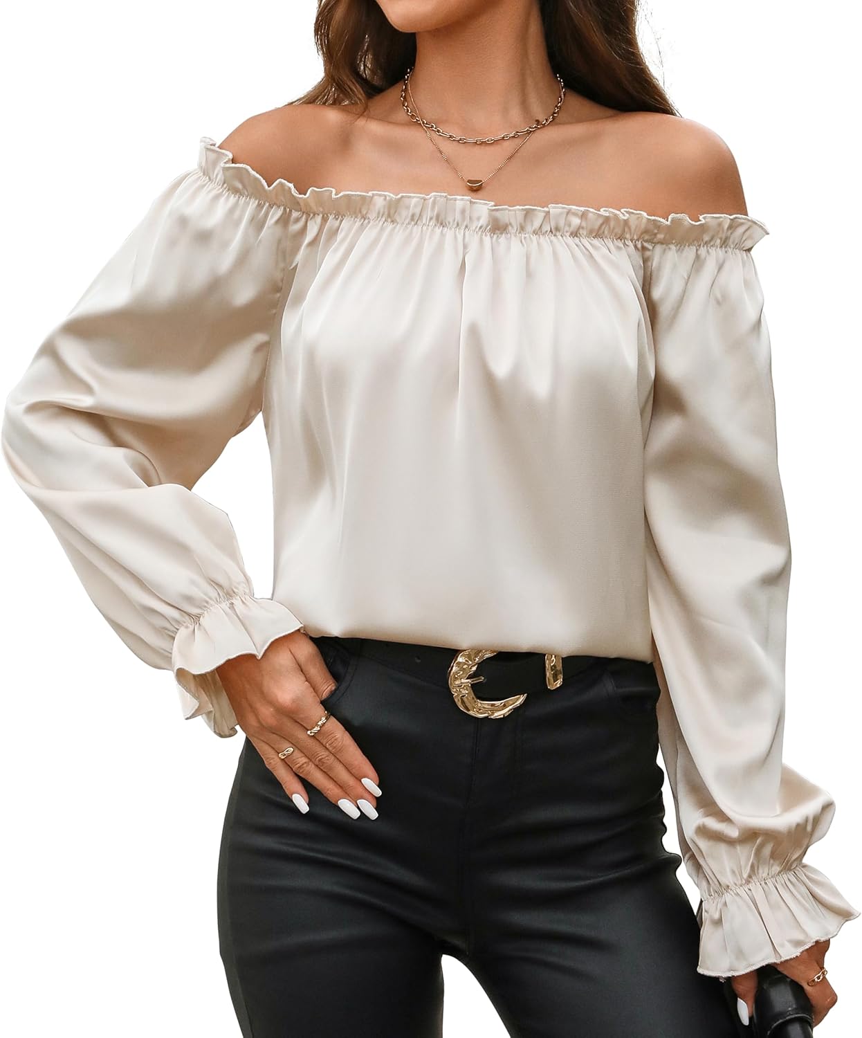 Womens Off Shoulder Satin Silk Ruffle Blouses Long Sleeve Shirt Casual Loose Tops