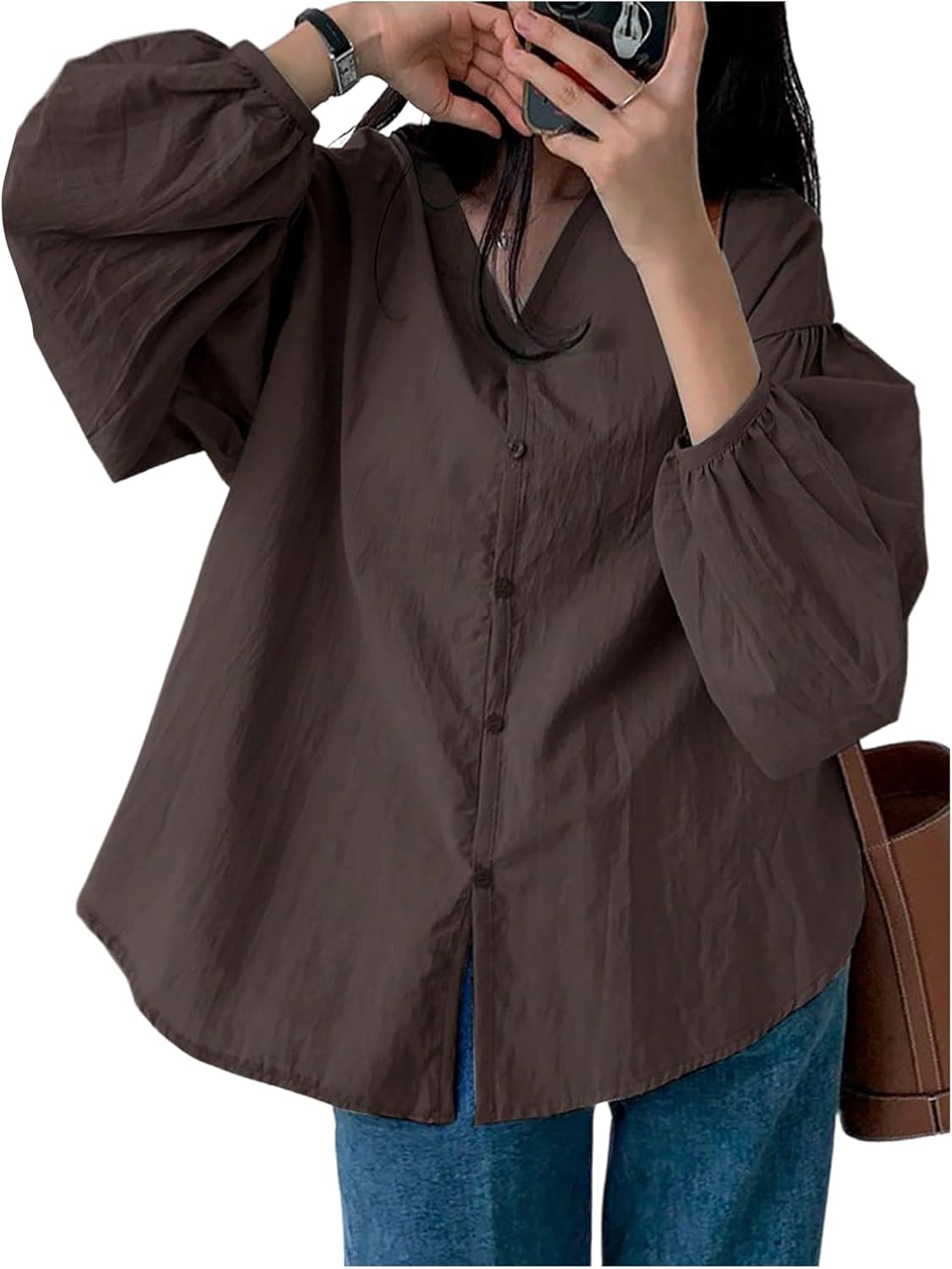 GORGLITTER Women's Bishop Long Sleeve Button Down Blouse Tops Dressy Casual V Neck Fall Business Work Oversized Shirts Coffee Brown Large