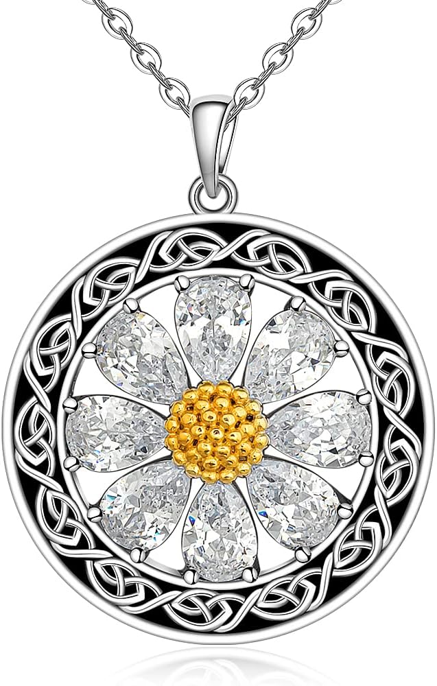 Daisy Necklace for Women Sterling Silver Celtic Knot Birth Flower Sunflower Necklace Pendant Cubic Zirconia Sunshine Daisy Jewelry Gifts
